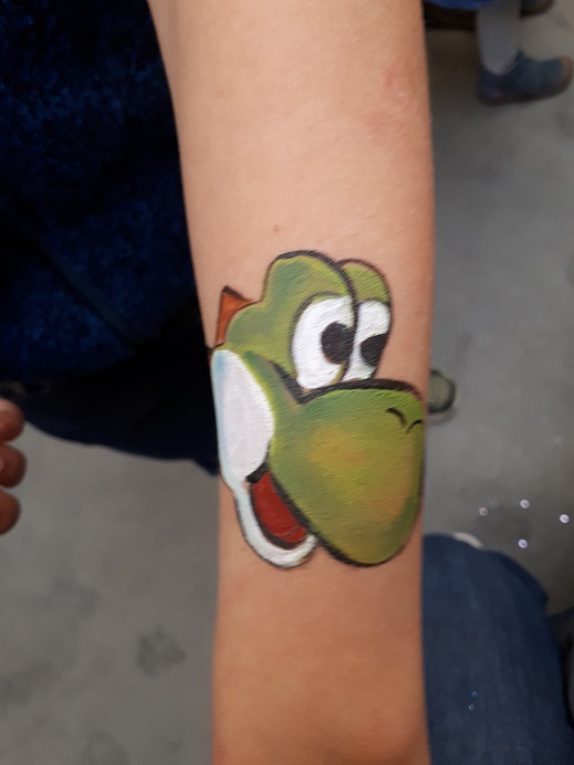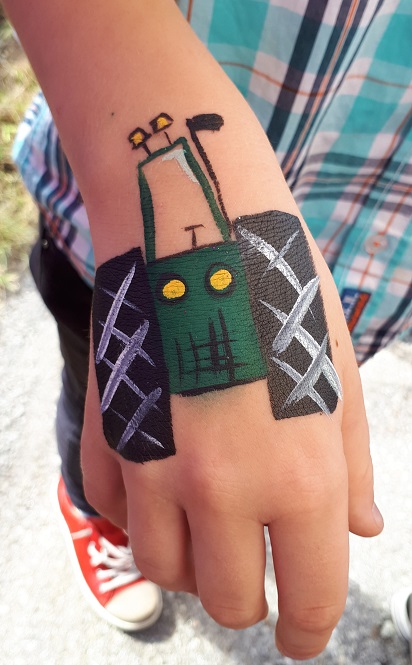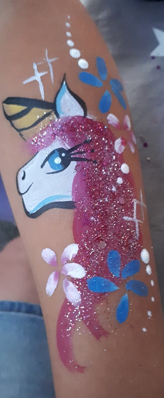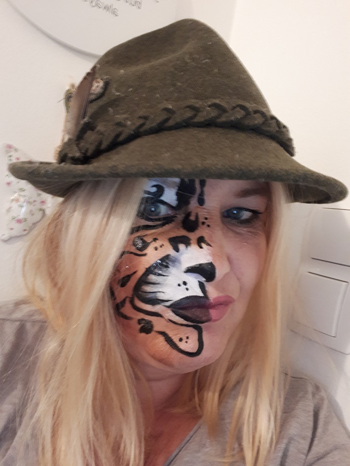 Wir arbeiten ausschließlich mit hautfreundlichen, wasserlöslichen Theaterschmink-Farben, die sich am Abend wieder leicht abwaschen lassen.