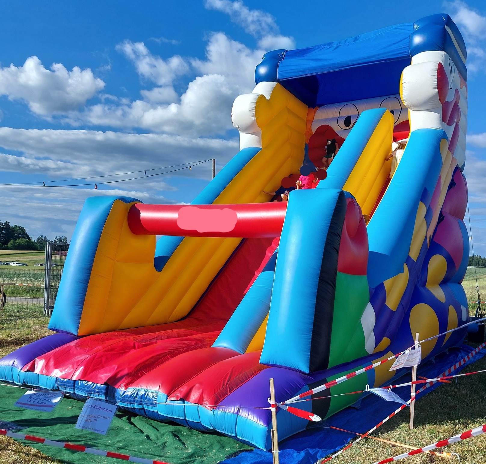 Die Mega Clown Rutschburg ist ein echter Hingucker. Mit der hohen Rutsche und dem fröhlichen Clown-Motiv begeistert sie Kinder jeden Alters.